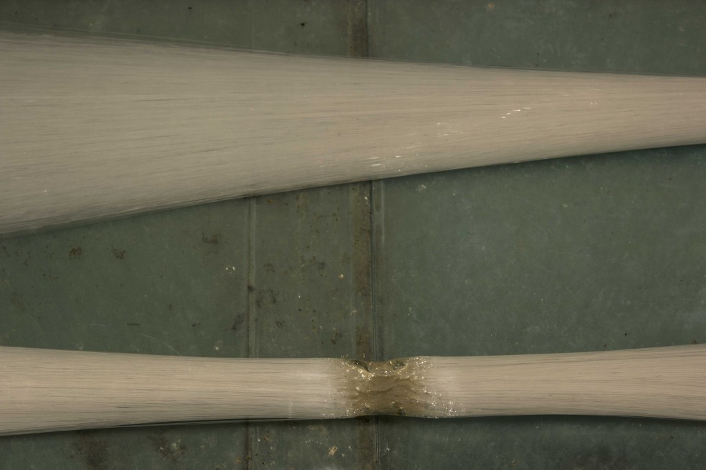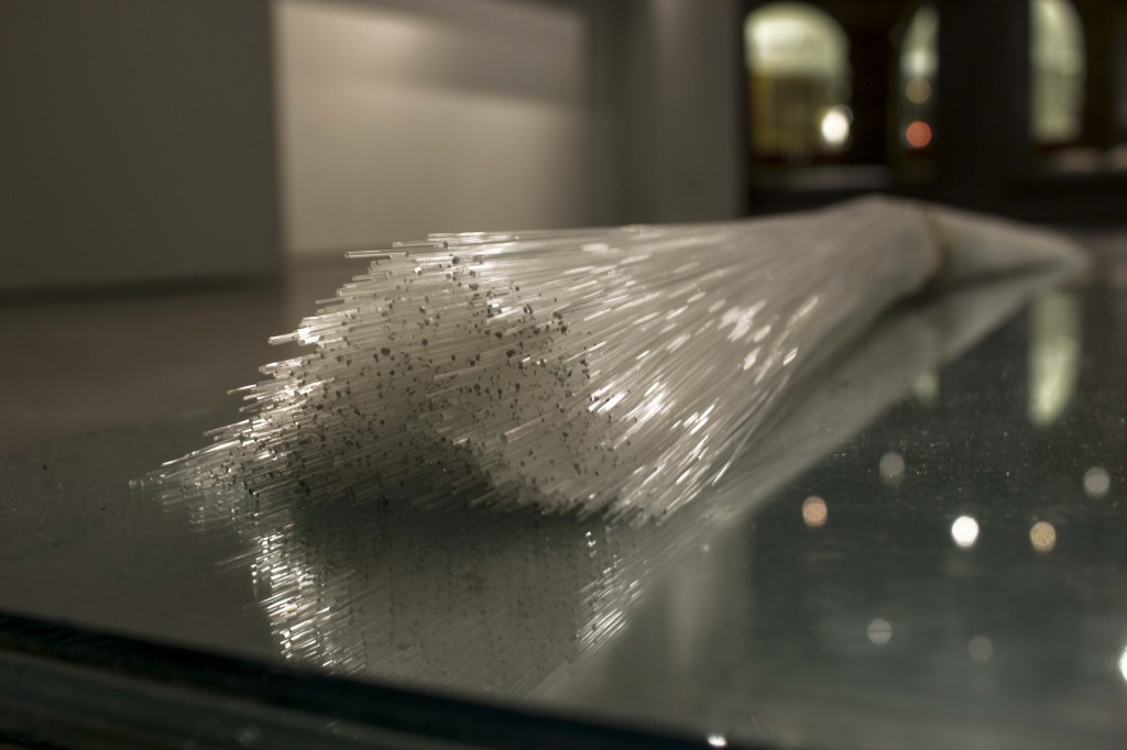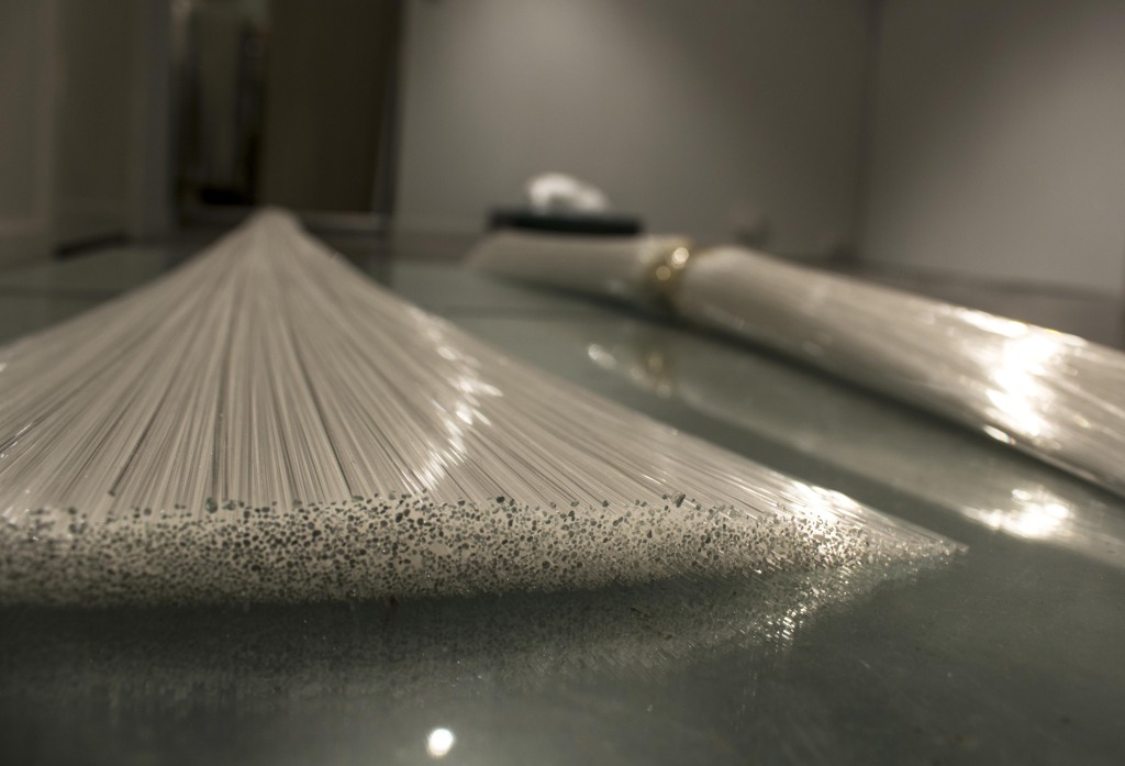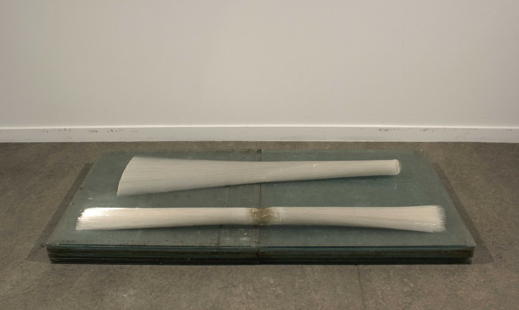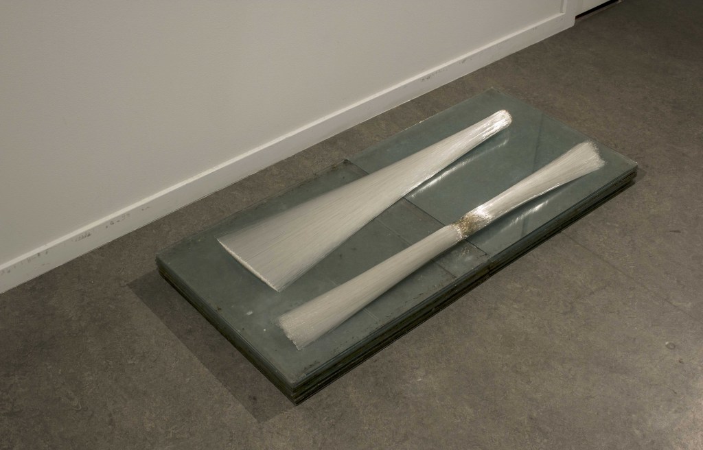 Glasstringers held together by its own materiality melted into one. Besides the area of it being solid, the stringers are still movable, adding fragility to the objects. Placed on sheets of old window glass.