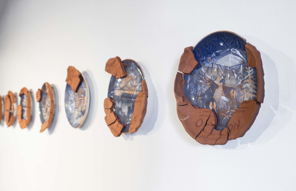 Christmas Platters made by Royal Copenhagen and B&G, covered with red clay and fired. Cracks occur due to tension between materials. The project is ongoing and number of platters continue to grow
