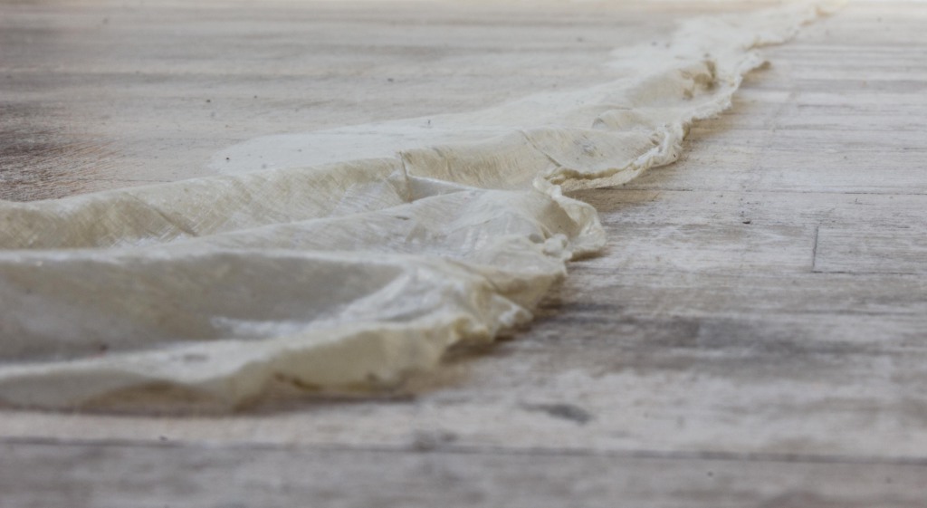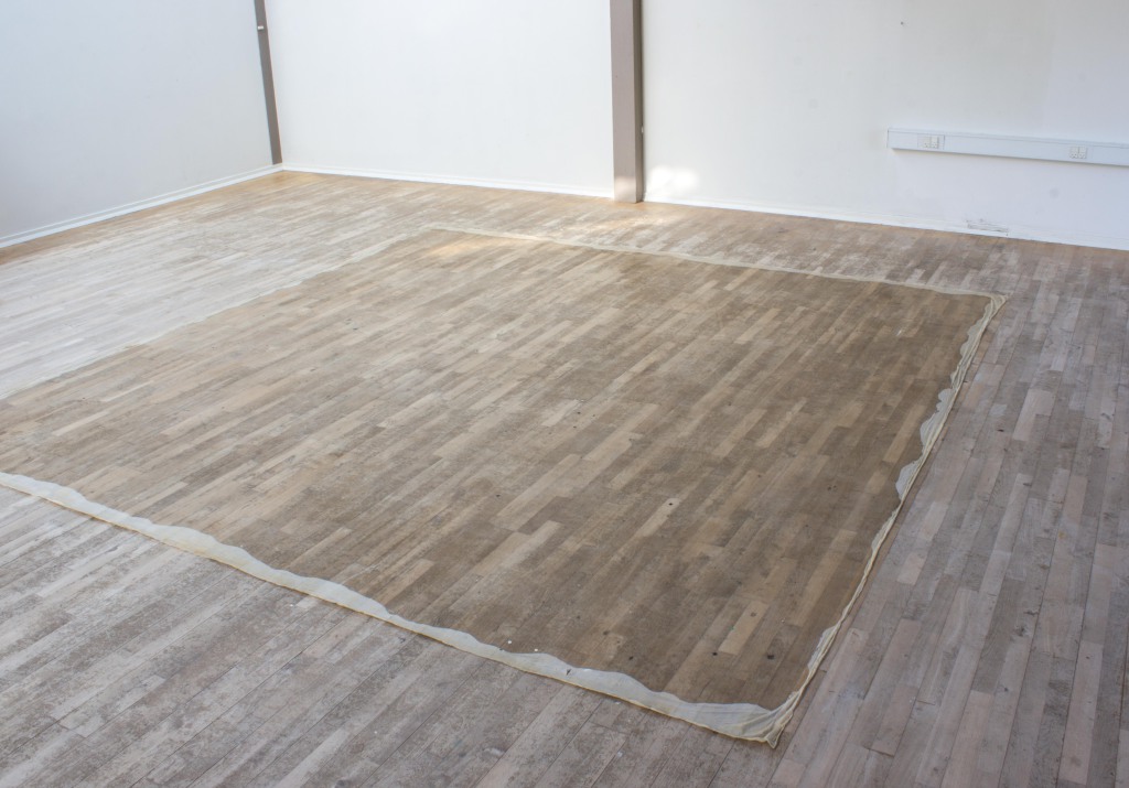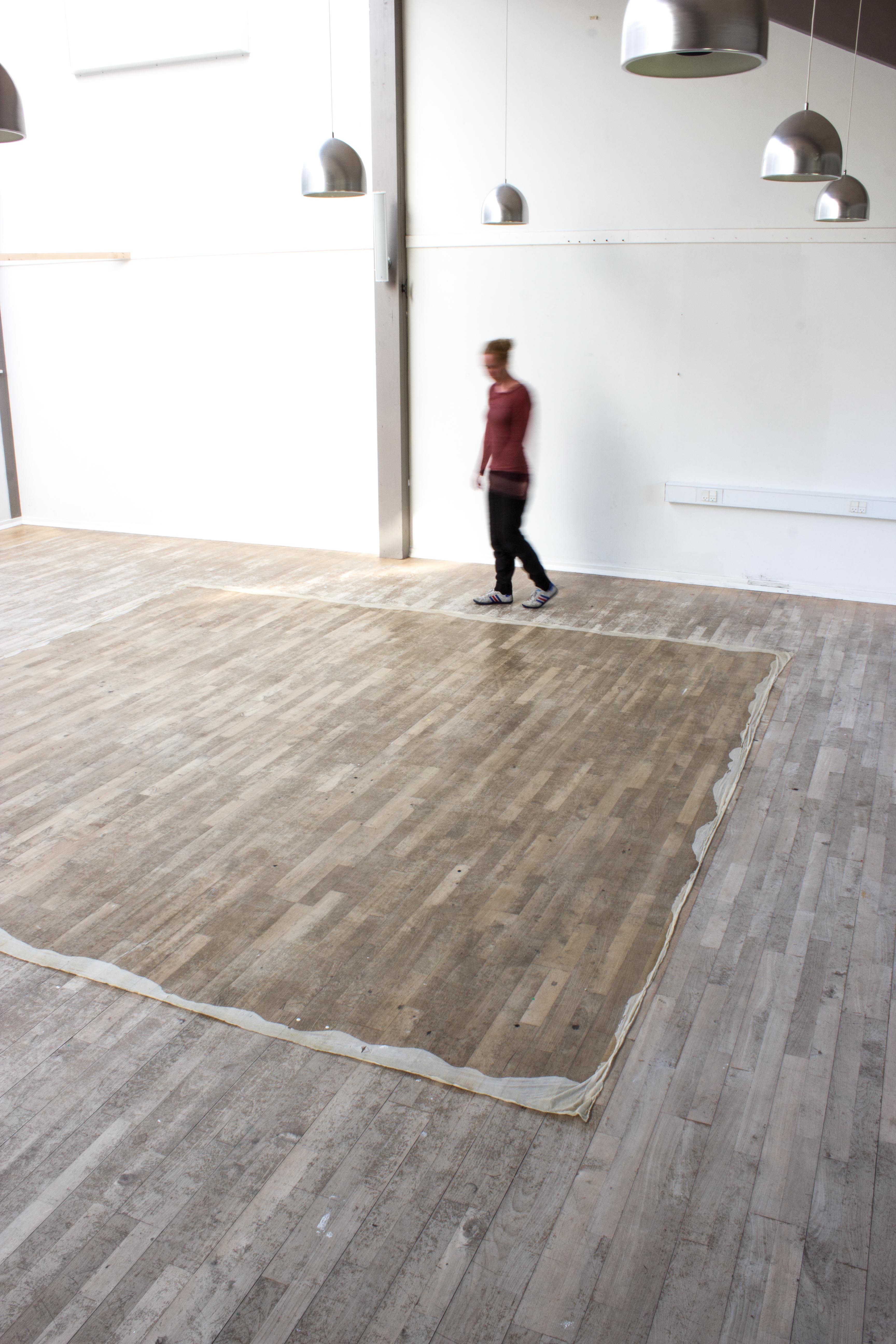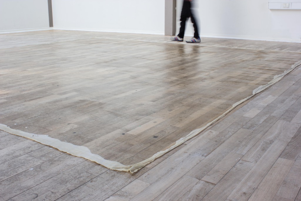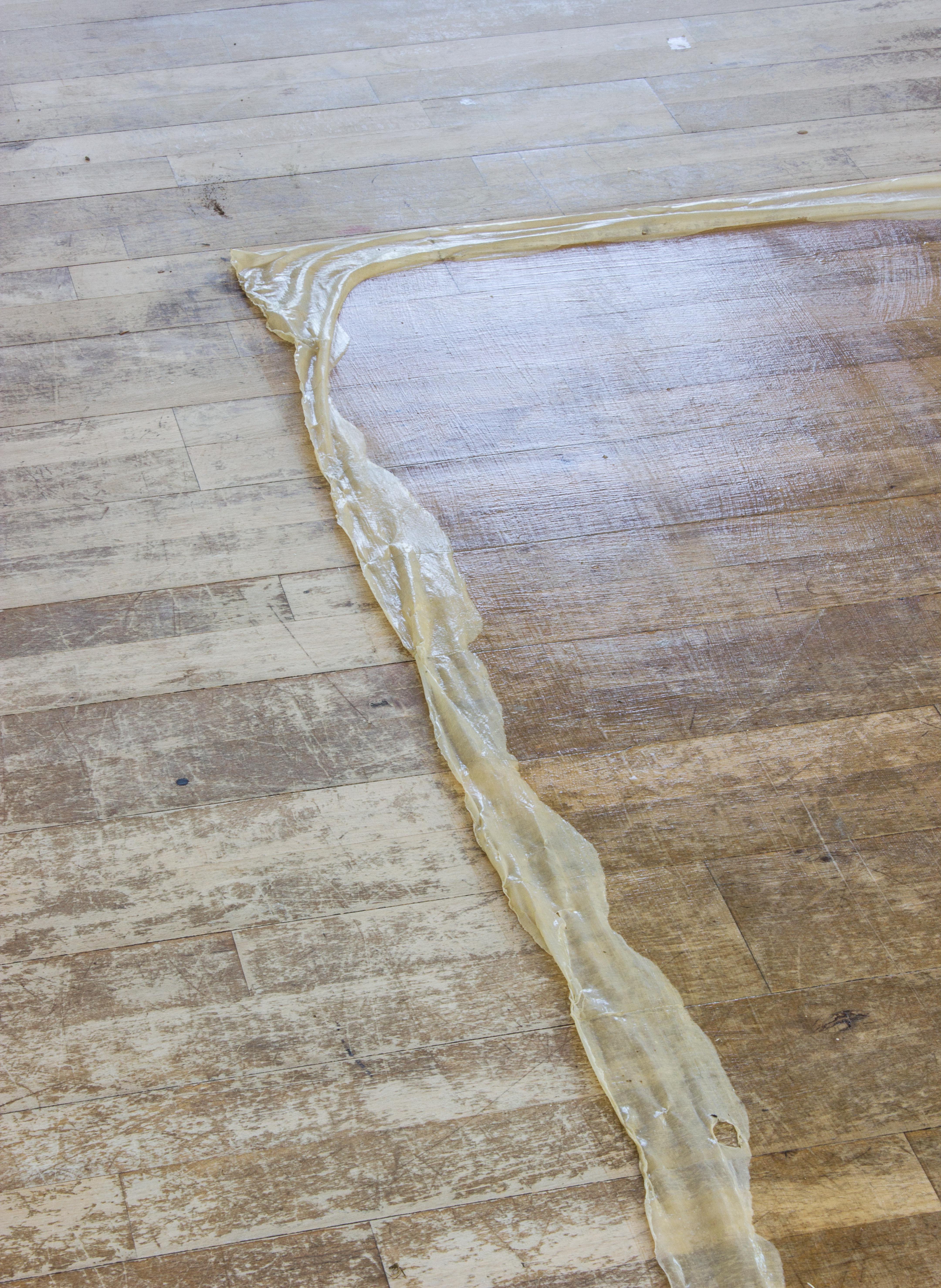 I painted a layer of latex directly onto the floor and then loosened it around the edge. It is the translucent layer of perception; one that we look through at anything we see as it is impossible for us to look at things objectively. The piece is meant to be walked on.