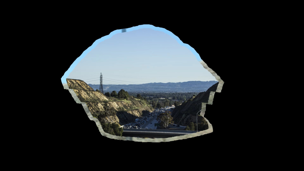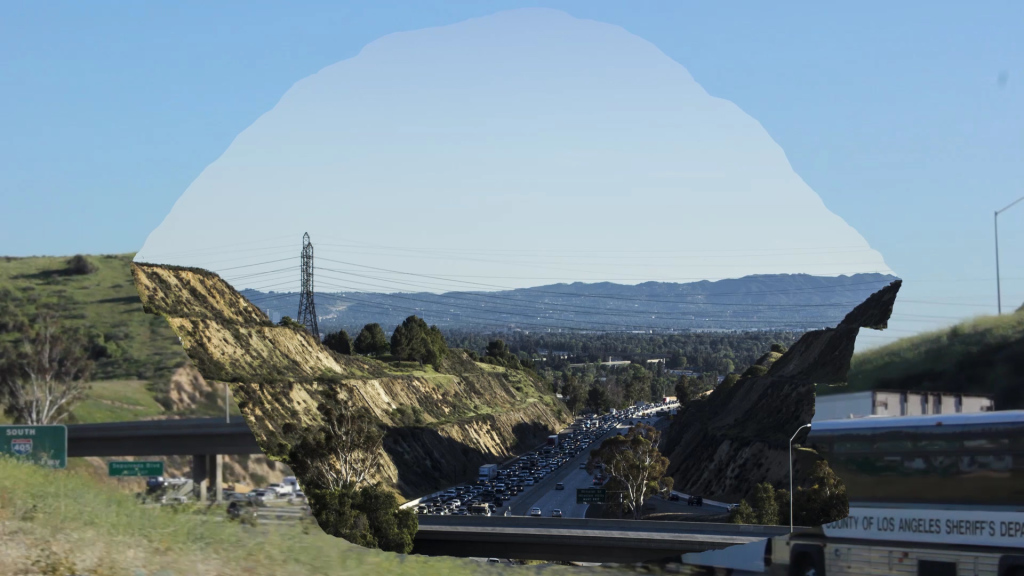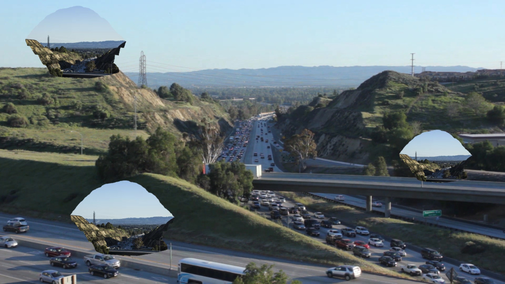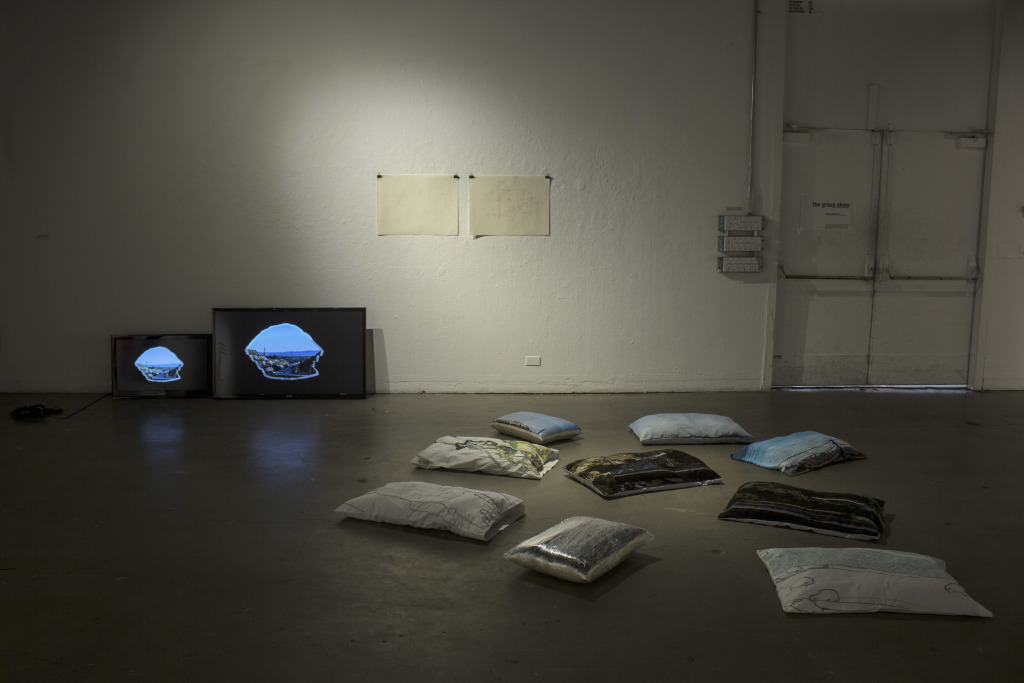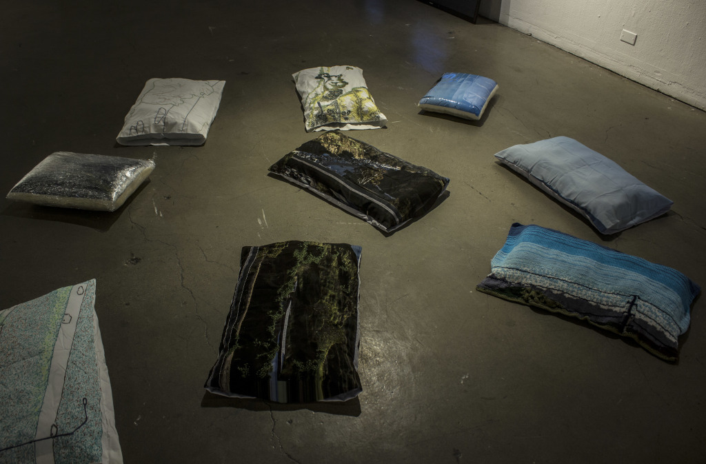 The work discusses relations between groups of people and addresses the lack of empathy among groups as well as discusing the separation now very apparent between people of different interests and beliefs both in Europe and the US. Part of the project is a video, in which a narrator tells a story about how a gap was created and the complications of its presence. In dialog with the video is a sculpture made of a wooden structure covered in paper. It is the physical “would-have-been-mountain”. The part that was removed from the mountain to make space for the freeway. Something that would make the mountain whole again, were it to be placed in the gap. In addition, nine different pillows on the ground make up the image of the gap seen from a distance, but each pillow’s image is constructed from different materials and scattered around the room without a real possibility of recreating a whole.