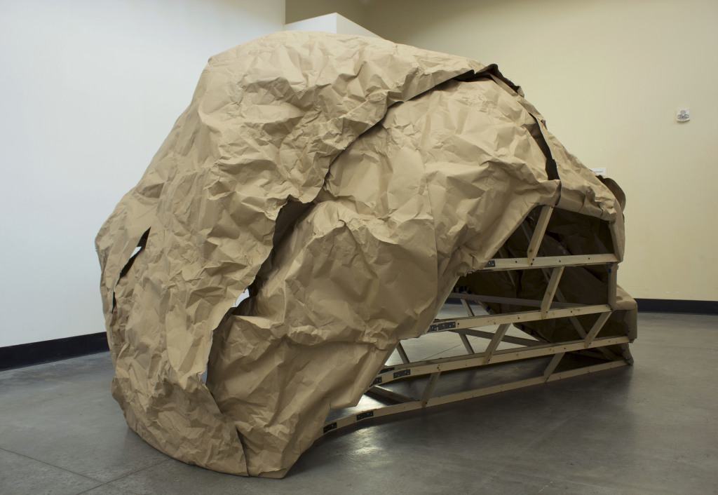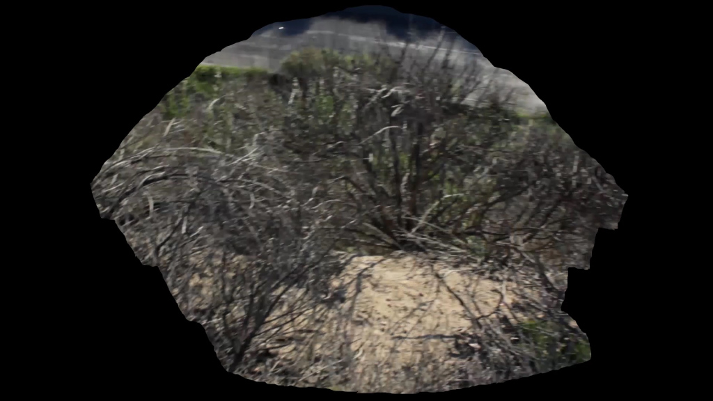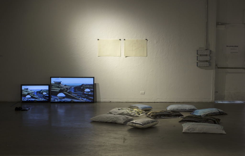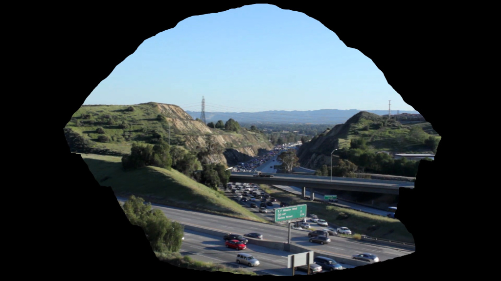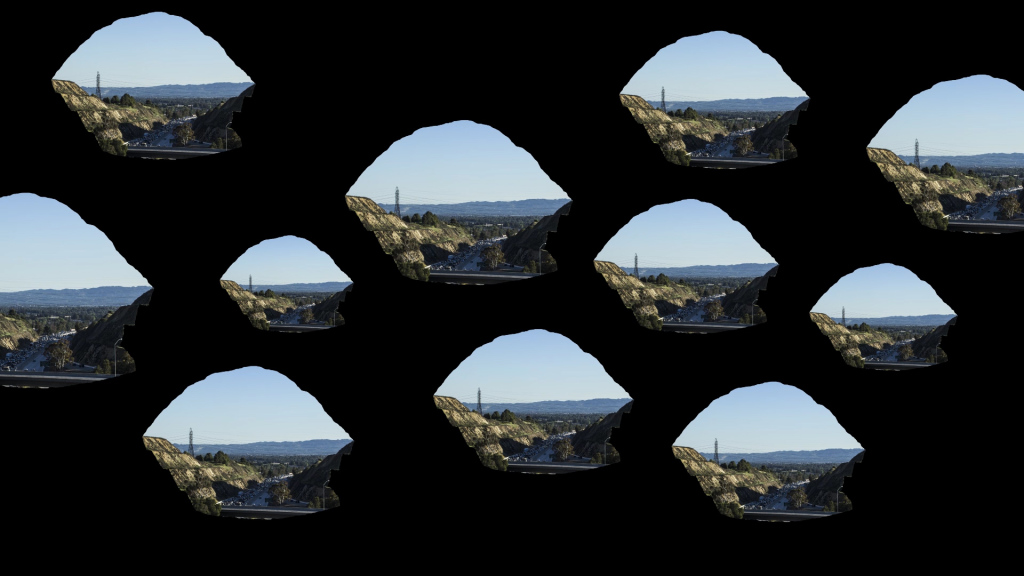 The work discusses relations between groups of people and addresses the lack of empathy among groups as well as discusing the separation now very apparent between people of different interests and beliefs both in Europe and the US. Part of the project is a video, in which a narrator tells a story about how a gap was created and the complications of its presence. In dialog with the video is a sculpture made of a wooden structure covered in paper. It is the physical “would-have-been-mountain”. The part that was removed from the mountain to make space for the freeway. Something that would make the mountain whole again, were it to be placed in the gap. In addition, nine different pillows on the ground make up the image of the gap seen from a distance, but each pillow’s image is constructed from different materials and scattered around the room without a real possibility of recreating a whole.