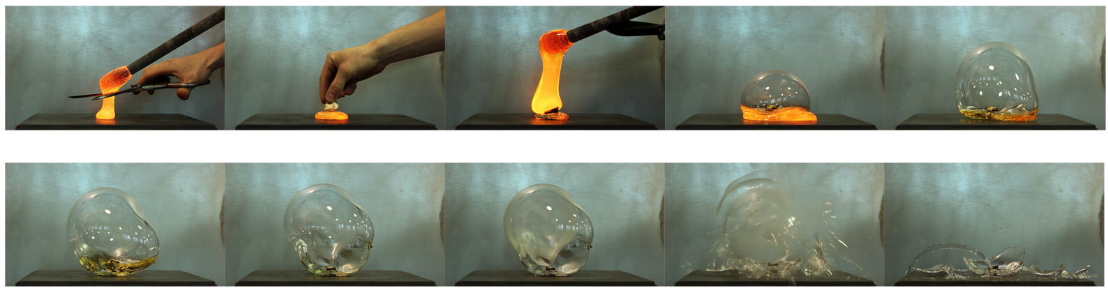 Normally a glassblower would take the lead and control what happens to glass. Here I have removed the glassblower and left it to the interaction of a mushroom with hot glass to determine the outcome: The moisture from the mushroom causes the glass to expand and the heat of the glass affects the shape. As the glass cools, it seems to become a static object, but constant pressure from the steam of the mushroom gives tension to the object and the glass finally explodes.